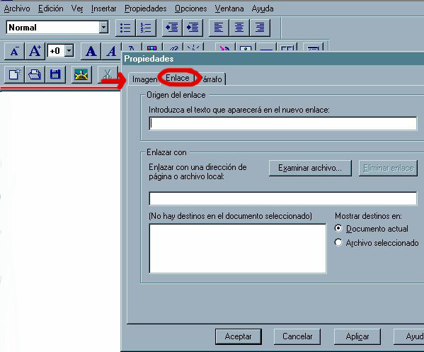 Para crear un enlace a partir de una imagen en NETSCAPE, haremos doble clic sobre la imagen (o haremos clic una sola vez, y luego haremos clic en el botón de objeto). Volverá a abrirse el cuadro de diálogo de imagen, pero en esta ocasión, buscaremos en la parte superior del cuadro la pestaña de Enlace, y haremos clic sobre ella. En la caja correspondiente (como se muestra en la imagen inferior), escribiremos el nombre del archivo del recurso al cual queremos enlazar.