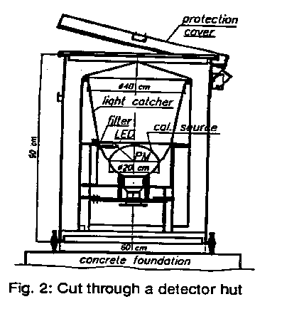 Este tipo de detectores es de los más utilizados en física nuclear y de partículas. Se basan en la propiedad que tienen algunos materiales de emitir pequeñas cantidades de luz cuando sobre ellos incide una partícula (especialmente si se trata de una partícula cargada). Esa luz es detectada por uno o varios fotomultiplicadores que la transforman en un impulso eléctrico que puede ser analizado electrónicamente para obtener información acerca de la partícula incidente (instante de llegada, energía...). Los detectores de centelleo del experimento HEGRA están situados en el interior de unas casetas metálicas de alrededor de un metro de altura (ver foto). Se utilizan para detectar las partículas cargadas de la cascada (en su mayoría electrones). Los tiempos relativos de llegada de partículas a las diferentes casetas nos permiten reconstruir la dirección de procedencia del rayo cósmico primario.